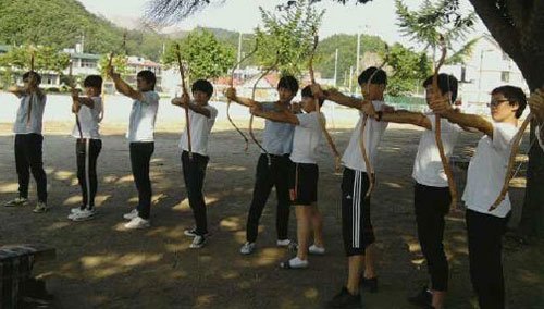 | 전국 89개 학교가 참여하는 ‘지역연합 방과후학교’ 여름방학 프로그램은 주5일 수업제를 앞둔 학생·학부모, 교사·학교에 많은 시사점을 던진다. 사진은 충북 단양 매포중학교에서 진행된 궁도교실. 단양교육지원청 제공 |
