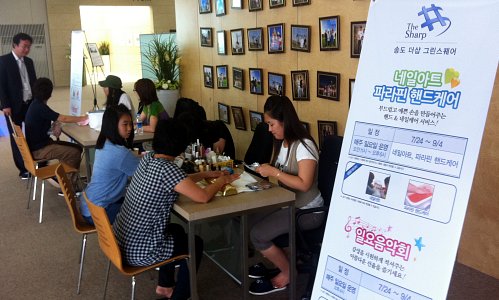 | 지난 24일 포스코건설이 여름 휴가철을 맞아 ‘송도 더샵 그린스퀘어’ 모델하우스에서 진행한 일요음악회를 찾은 방문객들이 현장에서 네일아트 서비스를 받고 있다. 포스코건설 제공 |