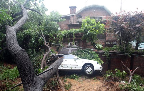 | 담장 덮친 나무 27일 산사태가 휩쓸고 간 서울 서초구 방배동 남태령 전원마을이 토사와 나무, 차량이 뒤엉켜 폐허로 변해 버렸다. 연합뉴스 |