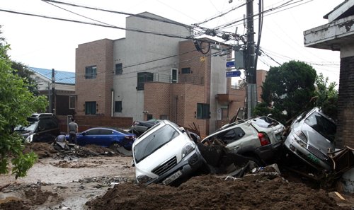 | 뒤엉킨 차량들 27일 오전 서울 서초구 우면산에서 일어난 산사태가 우면동 형촌마을을 덮치면서 토사에 휩쓸린 차량이 곳곳에 나뒹굴고 있다. 연합뉴스 |