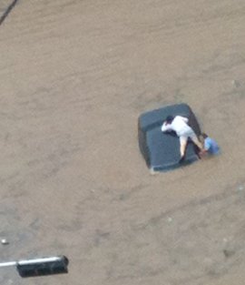 | 강남역 인근 진흥아파트 사거리에서는 오도가도 못하는 차량의 지붕과 문에 매달린 시민이 구조를 기다리고 있다. |