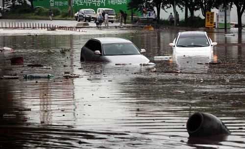 | 물에 잠긴 차량들 중부지역에 최고 300㎜가 넘는 물폭탄이 쏟아진 27일 서울 서초구 우면동의 도로가 침수돼 차량들이 물에 잠겨 있다. |