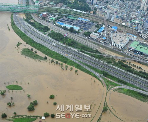 | 흙탕물에 잠긴 서울 사상 최악의 폭우로 서울 주요 간선도로 통제가 일부 계속되는 가운데 28일 올림픽대로와 63빌딩을 잇는 여의상류IC 부근이 흙탕물에 잠겨 있다. 이종덕 기자 |