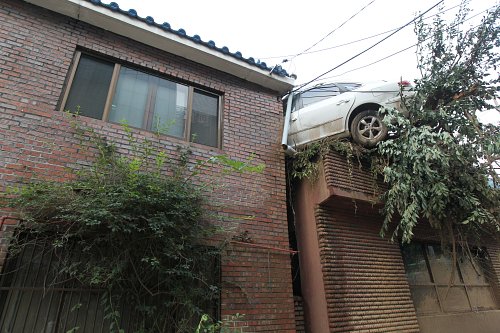 | 지난 27일 내린 폭우로 인한 우면산 산사태 피해를 입은 서울 서초구 방배동의 한 주택에 쓸려내려온 차량이 29일 오후까지도 그대로 박혀있다. |