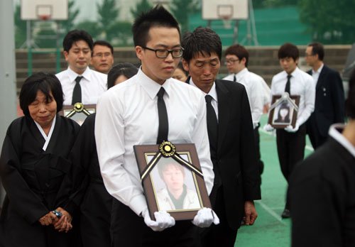 | 31일 오전 인하대학교 대운동장에서 열린 춘천 펜션 산사태 매몰 희생자들의 합동영결식에서 유족과 친구들이 영정사진을 들고 영결식장으로 들어서고 있다. 연합뉴스 |