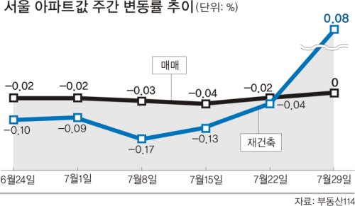 31일 부동산114와 국민은행, 부동산1번지, 닥터아파트에 따르면 지난주(7월29일 기준) 서울 아파트 매매시세 변동률은 0%로 조사됐다. 서울 아파트값이 하락세를 멈춘 것은 부동산114와 닥터아파트 집계로는 17주, 부동산1번지 집계로는 22주 만이다. 수도권 역시 지난주 보합세를 기록해 7주 만에 가격 하락이 중단됐다. 특히 부동산114 조사를 보면 서울 재건축 아파트 시세는 전주 대비 0.08% 올랐다.