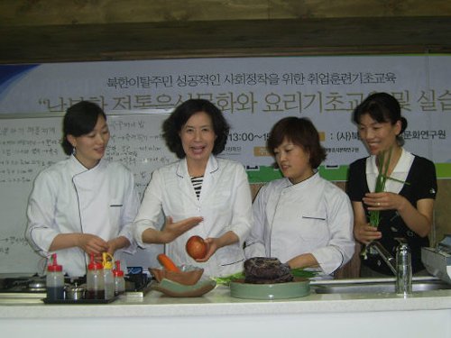| 이애란(왼쪽 두번째) 교수가 (사)북한전통음식문화연구원에서 강사들에게 북한 음식 요리법을 설명하고 있다. |