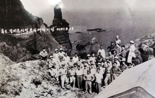 | 1954년 4월 결성된 독도의용수비대원과 해경이 같은 해 8월28일 독도 경비 초사 및 표식 제막을 한 뒤 기념 촬영을 하는 모습. 이 사진은 독도의용수비대장 고 홍순칠씨의 부인이자 대원이던 박영희(79·경기 구리시)씨가 소장하고 있다. 구리=연합뉴스 |