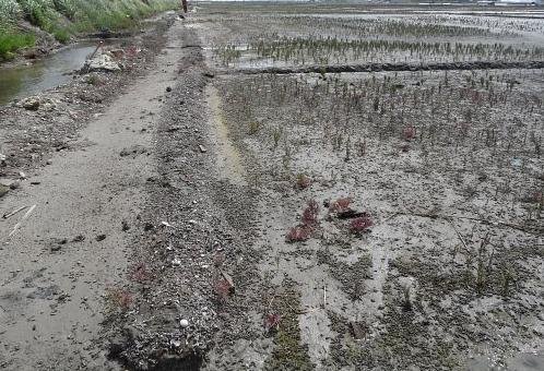 염둑과 증발지에 함초가 검게 말라 죽어있다.