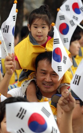 | 목말 타고 태극기 행진 제66주년 광복절인 15일 시민들이 태극기를 들고 서울 종로구청에서 보신각 앞까지 행진을 벌인 가운데 한 어린이가 아빠의 목말을 탄 채 태극기를 흔들고 있다. 연합뉴스 |