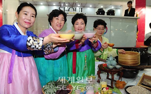18일 서울 삼성동 코엑스에서 열린 ‘서울국제외식산업박람회’에서 한복을 차려입은 참가자들이 단호박, 쑥, 자색고구마 등으로 제조한 막걸리를 선보이고 있다.