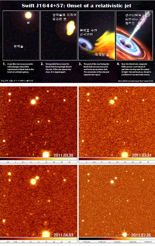 연구팀은 미국 NASA의 스위프트 위성을 이용해 지난 3월 28일 39억 광년 떨어진 곳에 있는 평범한 은하의 중심부가 갑자기 밝아지는 현상을 발견했고, 이 천체를 'Swift J1644+57'로 명명했다.
