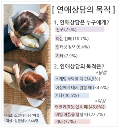그렇다면 요즘 젊은이들은 어떤 방법으로 연애 고민을 해결할까. 소셜 데이팅 업체 ‘이츄’(대표 표순규, www.echu.co.kr)가 20세 이상 미혼남녀 644명(남성 338명, 여성 306명)을 대상으로 ‘연애상담의 목적과 용도’에 대해 물어봤다.