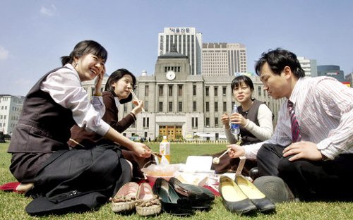 | 회사원들이 ‘서울광장’에서 점심 도시락을 나누고 있다. 스탠퍼드대 클리포드 나스 교수는 인간의 길흉화복도 인간관계의 결정물이라고 설파한다. 세계일보 자료사진 |