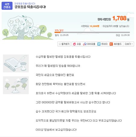 포털사이트 다음 아고라 등에는 '강호동 퇴출'과 관련한 청원 서명운동이 진행중이다.