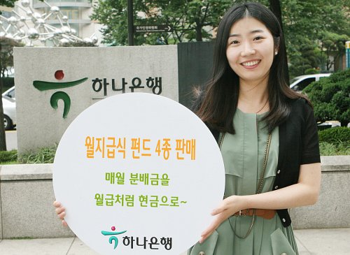| 월지급식 펀드는 수익이 많을 때는 매월 분배금을 월급처럼 투자자에게 지급해 인기를 끌고 있다. 다만 매달 일정액을 지급하는 연금과 달리 수익이 나지 않아 원금이 없어지는 최악의 경우에는 지급되지 않을 수도 있는 만큼 투자에 유의해야 한다. 하나은행 여직원이 월지급식 펀드를 선보이고 있다. 하나은행 제공 |