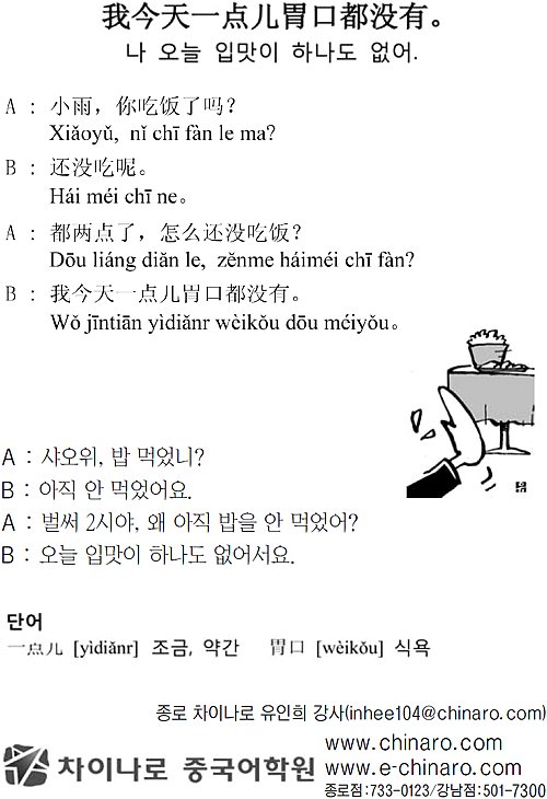 [生生 중국어 한마디] 나 오늘 입맛이 하나도 없어. 입력 : 2011-09-23 22:28:07 수정 : 2011-09-23 22:28:07 구글 네이버 유튜브 Copyright ⓒ 세계일보. 무단 전재 및 재배포 금지 세계일보