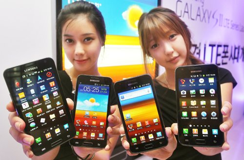 | 삼성전자 홍보 도우미들이 26일 서울 서초구 삼성전자 사옥에서 슈퍼아몰레드 디스플레이가 탑재된 LTE 스마트폰 ‘갤럭시S2 LTE’(오른쪽)와 ‘갤럭시S2 HD LTE’(왼쪽)를 소개하고 있다. 연합뉴스 |