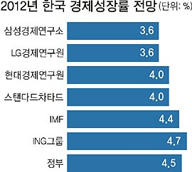 LG경제연구원은 3.6%로, 현대경제연구원은 4.0%로 예측했다. 국제통화기금(IMF)은 4.4%로, 스탠다드차타드(SC)는 4.0%로, ING그룹은 4.7%로 각각 전망했다. 한국경제연구원 변양규 거시경제연구실장은 “5∼6개월 전보다 경기하방 위험이 커진 게 사실”이라며 “장기간 저성장이 지속될 것”이라고 말했다.