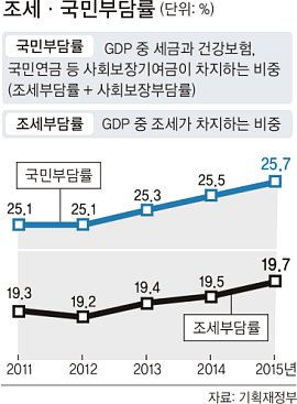그러나 국내총생산(GDP) 증가로 조세부담률은 19.2%로 올해보다 0.1%포인트 하락할 것으로 예상됐다. 사회보장금 부담은 늘어 조세부담률에 사회보장부담률을 더한 국민부담률은 올해와 같은 25.1%로 예측됐다.