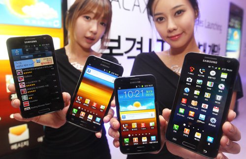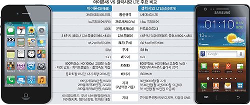 | 삼성전자가 5일 애플의 신제품 아이폰4S에 대한 판매금지 가처분 소송을 제기함에 따라 삼성과 애플 사이의 긴장감이 높아지고 있다. 지난달 26일 삼성전자 홍보 도우미들이 서울 서초구 삼성전자 사옥에서 ‘갤럭시S2 LTE’ 모델을 소개하고 있다. 연합뉴스 |