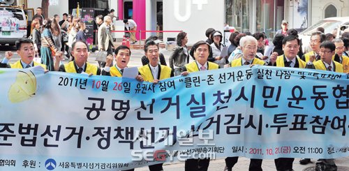 | “공명선거 실천” 10·26 재보선을 닷새 앞둔 21일 서울시 중구 명동에서 공명선거실천시민운동협의회 회원들이 투표참여를 촉구하는 거리 캠페인을 벌이고 있다. 이제원 기자 |