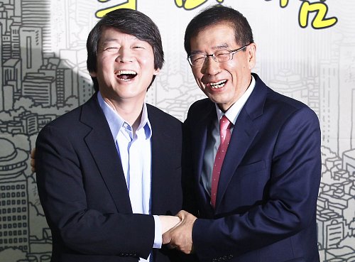 | 밝게 웃는 안철수와 박원순 안철수 서울대 융합과학기술대학원장이 24일 오후 안국동 박원순 후보의 선거캠프를 방문, 박 후보와 포즈를 취하고 있다. 안 원장은 "멀리서나마 (박원순 야권단일 후보를) 계속 응원하고 있었다"며 "열심히 하셔서 꼭 원하는 바를 이루길 바란다"고 밝혔다. <연합> |