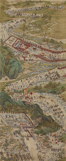 | 리움에 전시중인 정조의 화성 행차를 그린 작품 중 하나인 ‘환어행렬도’. 관람객은 맨눈으로 자세히 보기 힘든 그림의 세부까지 갤럭시탭과 고해상도 모니터를 활용해 자세히 볼 수 있다. |