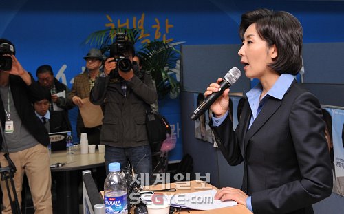 | 한나라당 나경원 서울시장 후보가 24일 서울 프레스센터 내 선거캠프 사무실에서 안철수 서울대 융합과학기술대학원장의 무소속 박원순 후보 지원을 비판하는 기자회견을 갖고 있다. 이재문 기자 |