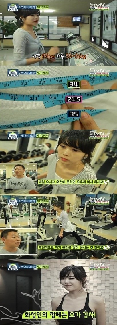실제로 그녀의 몸매는 완벽한 비율을 자랑했다. 헬스장에서 제작진의 요구에 직접 몸매 치수를 잰 결과 ‘34-24.5-35’ 수치가 나온 것. 자기관리녀는 “볼륨감 있고 S라인이 돋보이는 여성스런 몸매가 가장 예쁜 것 같다”고 스스로 평했다.