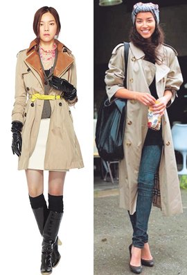 ‘바바리’로 통용되면서 트렌치 코트의 보통명사가 된 브랜드 버버리의 가을/겨울 컬렉션에서도 서로 다른 소재와 컬러를 대비시킨 ‘콘트라스트 슬리브’ 디자인들이 등장했다. 특히 네크라인에 탈부착 가능한 ‘퍼(fur·털)’가 있는 전형적인 스타일에서 벗어나 소매와 어깨 부분에 부분적으로 퍼를 적용한 디자인이 눈길을 끌었다. 국내에서도 베이지나 카키 등 기본 컬러에 소매만 블랙이나 데님 컬러로 차별화하거나, 라펠이나 허리 소매에 가죽과 데님 소재를 적용한 디자인을 많이 볼 수 있다.
