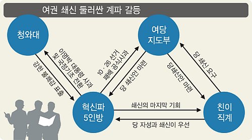 10·26 서울시장 보선 참패 후 분출된 쇄신론을 둘러싼 여권의 내홍이 격화하고 있다. 한나라당 소장 혁신파는 6일 이명박(MB) 대통령의 공개 사과와 국정 기조의 근본적 변화를 공식 촉구했다. 이에 맞서 친이(친이명박) 직계 의원과 청와대는 강력 반발했다. 쇄신 논의가 여권 내부의 역학관계와 맞물리면서 쇄신 주도권을 둘러싼 계파 간, 당·청 간 갈등이 확산되는 모양새다.