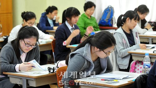 2012학년도 대학수학능력시험이 실시된 10일 오전 서울 종로구 안국동 풍문여자고등학교에서 수험생들이 시험 시작을 기다리고 있다. 이제원 기자 |