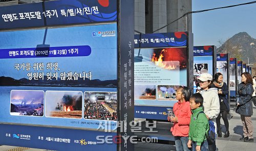 연평도 포격 1주년 사진전 입력 : 2011-11-14 18:59:33 수정 : 2011-11-14 18:59:33 구글 네이버 유튜브 14일 서울 세종문화회관 대극장 앞에서 국가보훈처가 개최한 ‘연평도 포격도발 1주기 특별사진전’을 찾은 시민들이 전시물들을 살펴보고 있다. 27일까지 열리는 이번 사진전에는 연평해전과 천안함 폭침, 연평도 포격도발 당시 사진과 해병대사령부·해군본부가 제공한 6·25전쟁 사진 등 200여점이 전시됐다. 이재문 기자 Copyright ⓒ 세계일보. 무단 전재 및 재배포 금지 세계일보