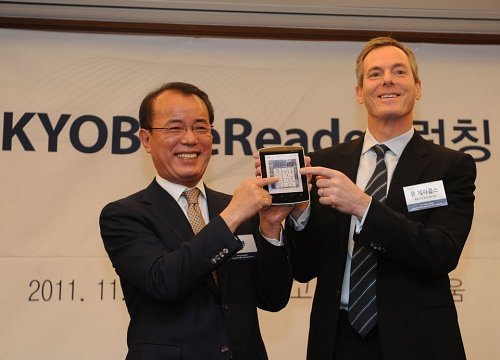 | 김성룡 교보문고 대표이사(왼쪽)와 폴 제이콥스 퀄컴 CEO 겸 회장이 22일 교보문고에서 전자책 단말기 '교보 이리더'를 소개하고 있다. 퀄컴 제공. |