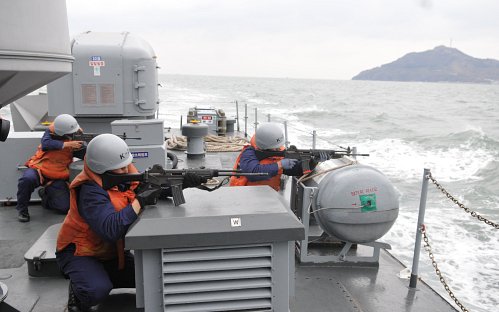 | 북한의 연평도 포격도발 1년을 하루 앞둔 22일 서해 연평도 인근 해상에서 실시된 긴급출동 훈련에 참가한 해군 2함대 고속정 장병들이 K-2소총을 겨누며 철통경계를 하고 있다. 해군 제공 |