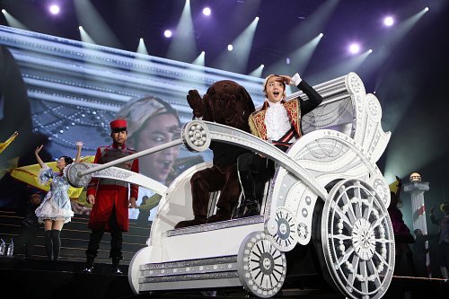 | 장근석이 도쿄돔 무대 위에서 은마차를 타고 객석을 향해 바라보는 퍼포먼스를 연출하고 있다. |