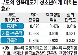 이에 따르면 부모가 자녀를 키우는 방식이 감독적(적절한 간섭과 기대)일 경우 청소년의 수업 태도, 학교 애착, 교우·교사 관계 등 학교생활 적응은 일반 학생보다 93.8%가량 뛰어났다. 자율·수용적인 태도의 부모가 자녀의 학교생활 적응에 끼치는 영향은 91.6%가량이었고, 통제(강압)적인 부모의 영향력은 -47.6%였다. 감독적 또는 자율·수용적인 부모를 둔 자녀는 자아존중감이 각각 89.4%, 93.8% 향상됐다. 이들의 삶의 만족도(행복감) 역시 각각 84.8%, 93.1% 향상되는 등 긍정적인 영향을 받았다.