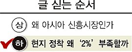 해외에 진출한 한국 보험사 역시 현지 정착에서 ‘2%’ 부족하다는 평이다. 손해보험사들은 순이익을 내고 있으나 해외에 진출한 한국 기업을 상대로 한 영업 비중이 큰 편이다. 교포보다는 현지 소비자를 상대해야 할 일이 많은 생보사는 보험영업에서 아직 적자를 잇고 있는 실정이다. 해외진출 초기라 인력, 조직 등 영업기반 확대를 통해 어느 정도 외형을 갖추기까지는 사업비 등 부담이 클 수밖에 없다는 것이 업계의 설명이다.