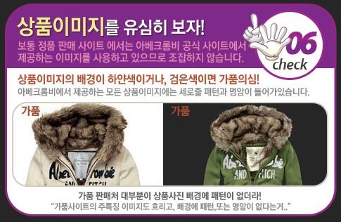우선 아베크롬비 판매처의 경우에는 상품 이미지만으로도 구별할 수 있는 방법이 있다. 아베크롬비 정품 판매사이트에서는 보통 아베크롬비의 공식홈페이지에 등록된 이미지를 사용하여 제품을 홍보한다. 공식 이미지의 배경은 회색에 세로줄패턴과 명암이 들어가 있지만 배경이 흰색, 검은색이라던지 상품을 흐리게 처리했거나, 패턴, 명암이 없다면 의심을 해보아야 한다.