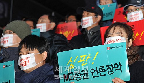 종편 반대 총파업 집회 전국언론노동조합 회원들이 1일 서울 종로구 광화문 세종문화회관 앞에서 여론 다양성을 위협하고 광고시장을 교란한다며 종합편성채널 반대 총파업 집회를 벌이고 있다. 이재문 기자 |