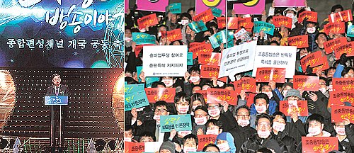 특혜시비 속에 종합편성(종편) 4개 채널이 개국했으나 낮은 시청률과 선정성 시비로 고전을 면치 못하고 있다. 지난 1일 세종문화회관에서 열린 종편 개국 기념쇼에서 김황식 총리가 축사를 하고 있다(왼쪽). 같은 시각 행사장 밖에서는 언론·시민단체들이 종편 출범에 항의하는 집회를 열고 있다. 세계일보 자료사진 |