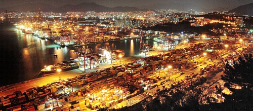 불꺼지지 않는 무역 전초기지 우리나라 무역규모가 5일 세계 아홉번째로 1조달러를 돌파했다. 사진은 지난 4일 환하게 불을 밝힌 부산광역시 남구 용당동 신선대 부두에서 수출품을 담은 컨테이너 선적 작업이 진행되고 있는 모습이다. |