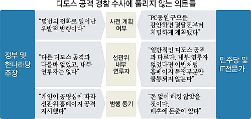 수사 당국이 6일까지 밝혀낸 선관위 디도스 공격 사건의 전말이다. 한나라당은 이번 사건을 “공명심에 불탄 일개 비서가 우발적으로 저지른 일”로 축소하고 있다. 그러나 일부에서는 여전히 풀리지 않는 의혹의 눈길을 거두지 못하고 있다. 사전 계획과 선관위 내부 공모자 연루 여부, 범행 동기 등에 대해 의심을 살 만한 요소들이 곳곳에 보이기 때문이다.