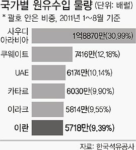 지난주 미 상원에서 통과된 국방수권법안은 이란 중앙은행과 거래하는 외국 금융기관은 미국 은행과 거래하지 못하도록 하는 내용을 담고 있다. 이 법안은 이번 주중 미 하원 통과가 확실시된다. 이 법안이 발효되면 올 1∼10월 기준으로 우리나라의 전체 원유 수입량 가운데 9.6%를 차지하는 이란산 원유 도입이 어려워진다.