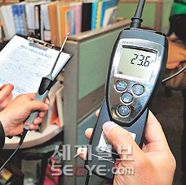서울 중구청 직원들이 15일 명동에 있는 한 빌딩에서 내부 온도를 측정하고 있다. 이곳 온도는 23.6도를 기록, 정부의 ‘난방온도 섭씨 20도 제한’ 기준을 무색케 했다. 김범준 기자 |