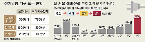 최근 들어 겨울철 전력 수요는 급증세다. 2000년 이후 1월 최대 전력 수요는 연평균 7.6% 늘어났다. 매년 400만㎾씩 증가한 셈이다. 전기 난방기구가 주범으로 지목된다. 예전에는 냉방 수요가 많은 여름철에 주로 최대 전력 수요가 발생했다. 하지만 2009년 이후에는 반복되는 이상한파와 전기 난방기기 보급 증가로 겨울철에 최대 전력 수요가 발생하고 있다.