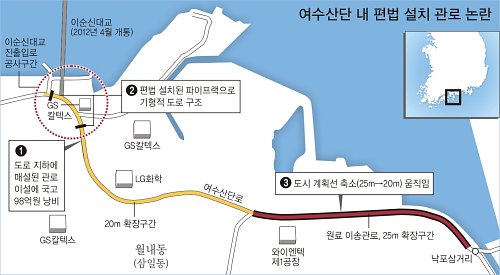 GS칼텍스의 이송관로는 여수산단도로의 와이앤텍 정문∼낙포 1.1㎞ 구간에도 설치돼 있다. 이 구간은 시내로 들어가는 진입로다. 지금도 도로폭이 14m로 좁아 출퇴근 시 교통체증이 빚어지고 있는데, 이순신대교가 개통되면 통행량이 더욱 늘 것으로 보인다.