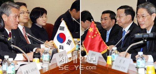 | 27일 서울 도렴동 외교통상부 청사에서 열린 제4차 한·중 고위급 전략대화에서 박석환 외교부 1차관(왼쪽 끝)과 장즈쥔 중국 외교부 상무부부장(오른쪽 끝)이 김정일 사후 한반도 정세 등 현안에 대해 논의하고 있다. 이재문 기자 |