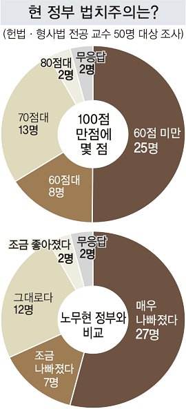 2일 본지가 전국 법학전문대학원(로스쿨)의 헌법·형사법 전공 교수 50명을 상대로 실시한 심층 설문조사 결과에 따르면 절반에 해당하는 25명이 현 정부의 법치주의 수준에 ‘60점 미만’의 낮은 점수를 매겼다. 8명은 ‘60점대’, 13명은 ‘70점대’라고 평가했다. 비교적 후한 ‘80점대’를 매긴 교수는 2명에 불과했고, ‘90점 이상’이라고 평가한 교수는 한 명도 없었다.